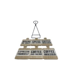 Set of Six Coffee Slogan Coasters On Metal Stand
