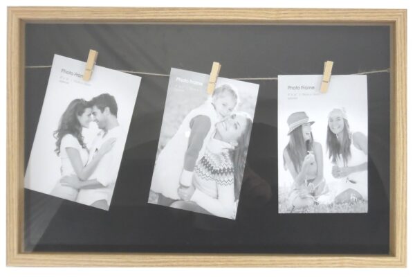 A natural wood effect box style photo frame with pegs which takes three 6″ x 4″ photos. This unusual frame is perfect for displaying special photos on the wall anywhere in the home. There is a washing line style string and three mini clothes pegs to hold your chosen photos against a plain black background. The frame also allows for your pictures or other small bits of memorabilia to truly stand out in pride of place behind the glass front. This frame is designed to be wall hung using the picture bracket on the back. (fixings not include.) Would make a great unusual gift. Measurements: 28 x 43 x 4cm SKU: PH2002