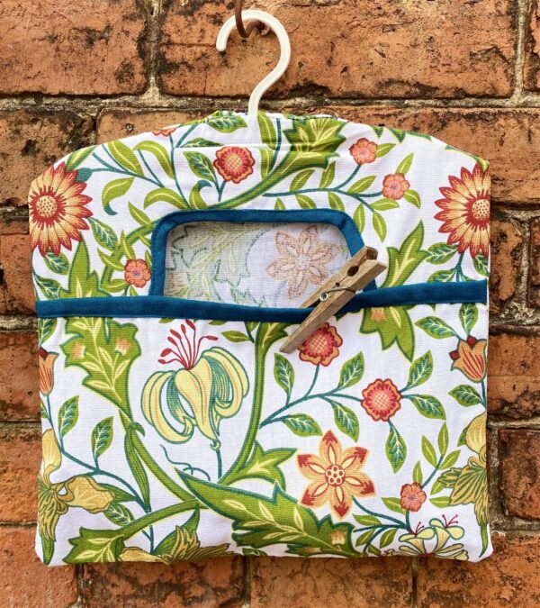 A hanging peg bag made from 100% cotton in the Sussex botanical range print. A plastic hanger is sewn in the top for practicality and a subtle blue coloured binding enhances the front pouch access. Measurements: D1 x H36 x W30cm