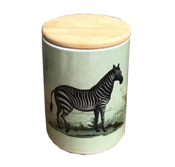 A white ceramic single storage canister with a bamboo wood lid. This canister is perfect for use in the kitchen or bits and bobs around the home, with an air tight sealed bamboo wood lid. This canister is decorated with a green based vintage style print of a zebra. Food safe. Not dishwasher safe. Measurements: 10 x 10 x 14cm SKU: TJN0175