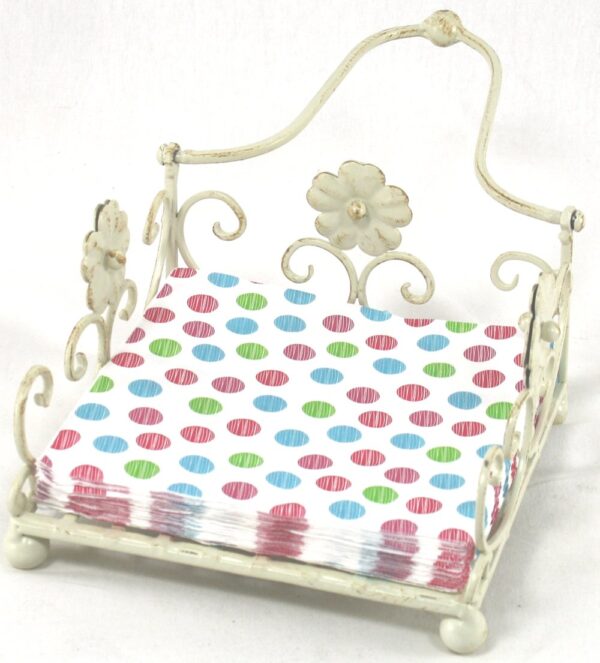 Part of our shabby chic kitchen range is this daisy design napkin holder in a cream and antique gold distressed paint finish. Will hold 17cm square napkins. Made of metal with a distressed cream and antique gold paint finish. Measurements: 19 x 11 x 19cm