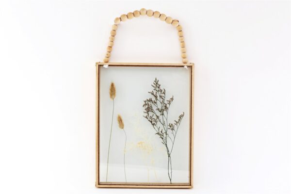 Delicately pressed assortment of dried wild grasses, on display in-between two pieces of glass encased in a 25 cm x 32 cm wooden frame. The frame features a string of wooden beads, perfect for bringing a floral flourish to your walls. Overall height of frame including the string of beads when hung from a fixing on a wall is 49cm. Measurements: D2.5 x H32 x W25cm