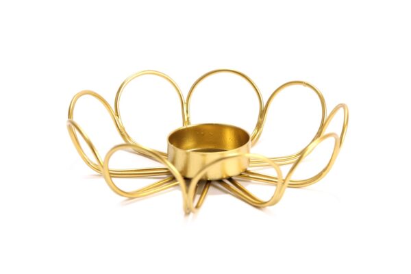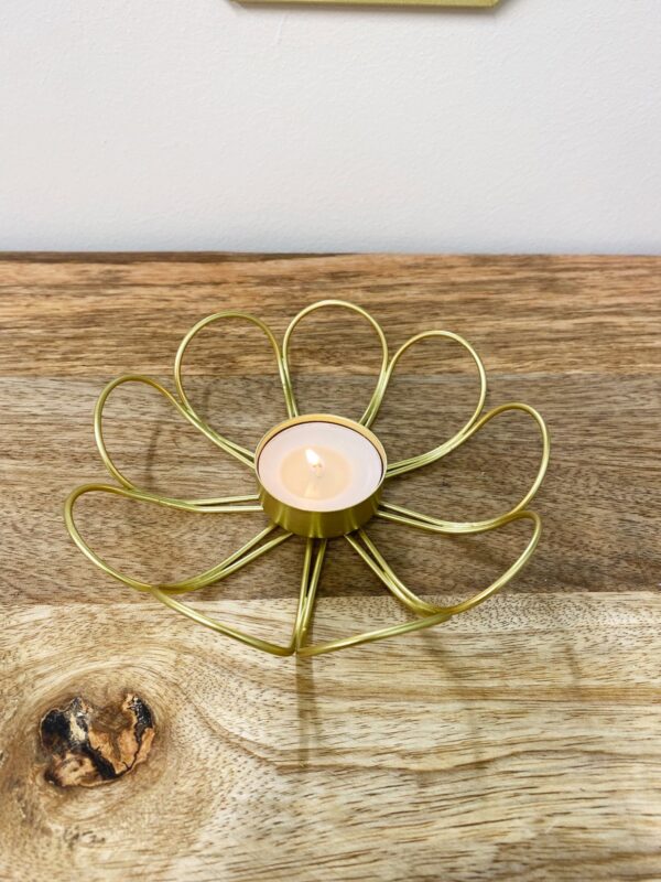 Metal gold coloured flower shaped tealight holder. The wire is crafted to replicate the petals of a flower with the tealight holder centralised. Measurements: D13 x H3.5 x W13cm SKU: BP0106