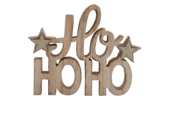 Wooden cut out “Ho Ho Ho” freestanding decoration. With two gold glitter wooden stars. Measurements: D2 x H15 x W18cm