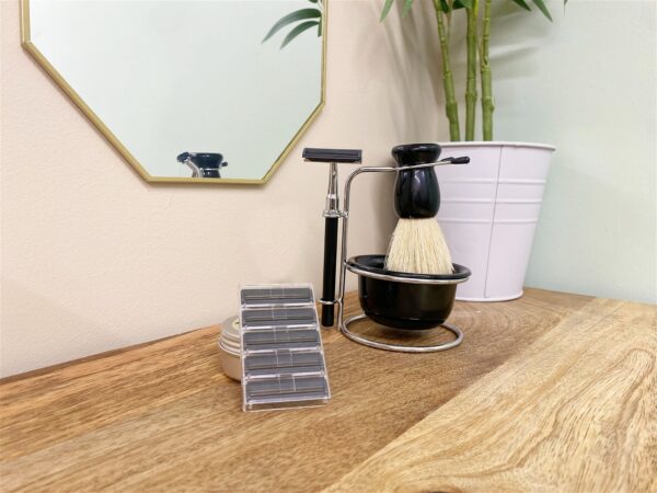 A three piece shaving kit with real bristle shaving brush, plastic moulded shaving foam pot, a traditional razor and set of six replacement blades. An elegant shaving stand in silver with black detailed brush handle, bowl and razor shaft compliment each piece beautifully. This is presented in a gift box from the gentleman’s essentials range and would make an ideal gift. Boxed measurements: D10 x H14 x W10cm SKU: GR0003