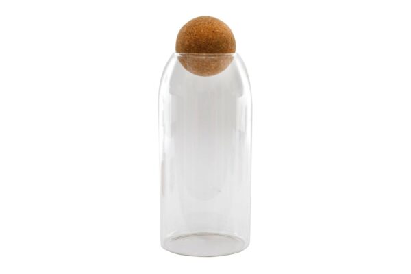 A glass storage canister with a round soft cork stopper suitable for storing many different food products or alternatively without the cork, as a flower vase. The shaped glass is 20cm tall with a subtle shaping at the neck from a base diameter of 9cm to 6cm. Boxed measurements: D11 x H26 x W11cm SKU: KG1036