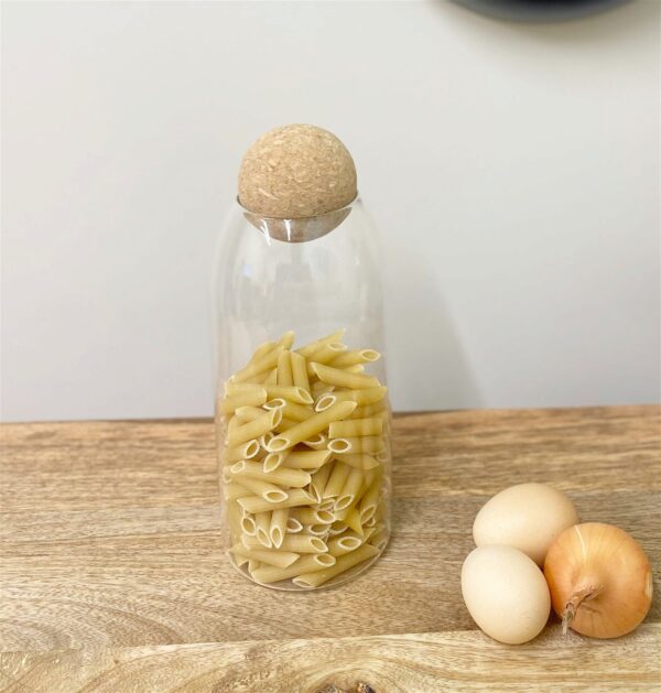A glass carafe style storage canister with a soft cork stopper providing an air tight container for many different food products. The carafe shaped glass is 26cm tall with a slight narrowing at the neck from a base diameter of 8.5cm to 6cm. Boxed measurements: D10 x H30 x W10cm SKU: KG1037