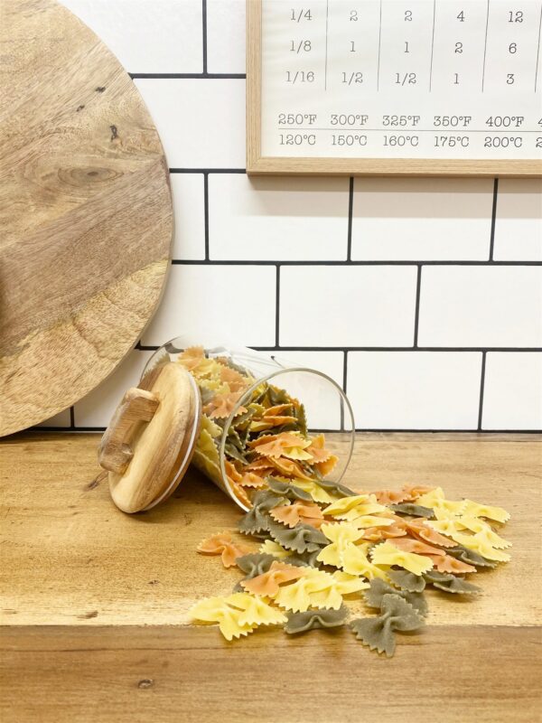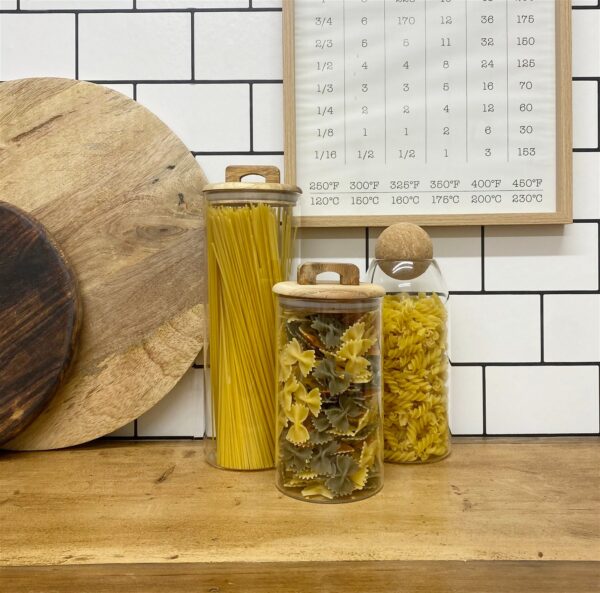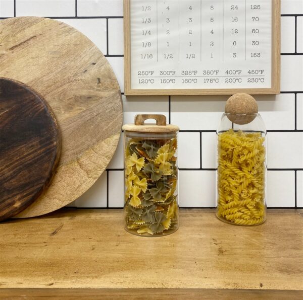 Bring charm and interest to your shelves, with this storage jar made from glass. Featuring an Acacia wood lid with an airtight sealer. Not only as we all try to reduce our plastic use, these stylish yet practical pieces are perfect for keeping grains and pulses fresh. This jar holds up to 1.2 litres. Available in a range of different sizes. Measurements: D10 x H21 x W10cm