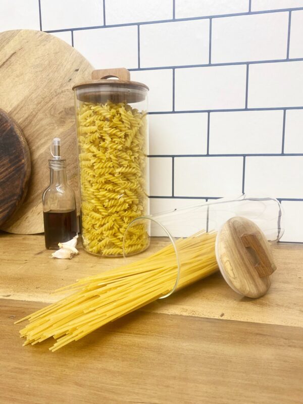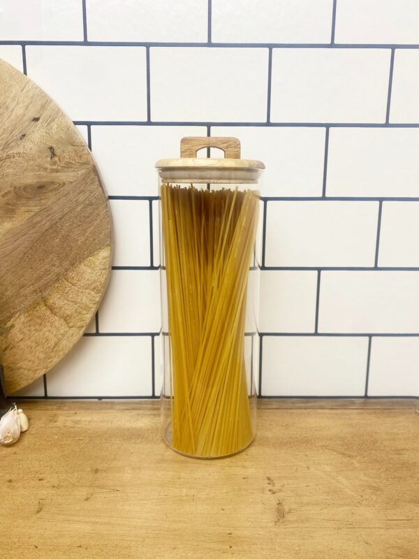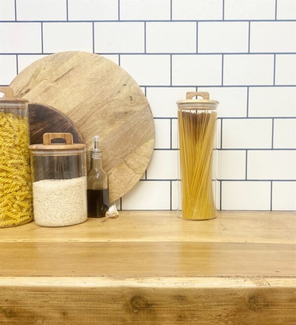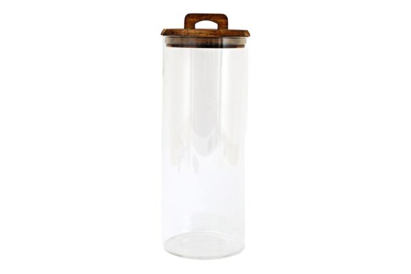 Bring charm and interest to your shelves, with this storage jar made from glass. Featuring an Acacia wood lid with an airtight sealer. Not only as we all try to reduce our plastic use, these stylish yet practical pieces are perfect for keeping grains and pulses fresh. This jar holds up to 1.7 litres. Measurements: D10 x H27 x W10cm