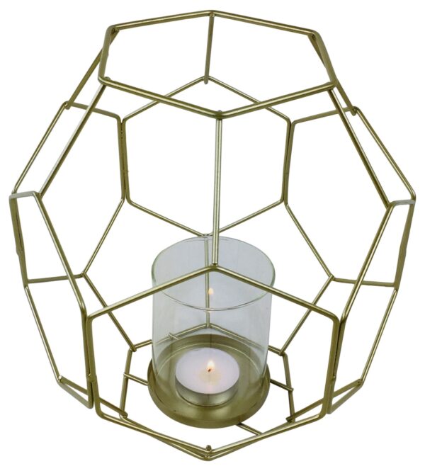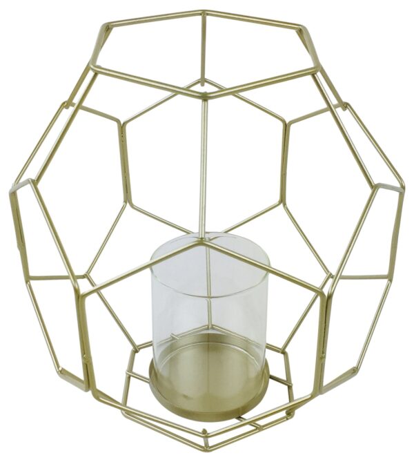 This unique candleholder combines delicately poised hexagons and pentagons to create its geometric frame design. The candle holder looks great with various tea lights or even larger candles, lighting up your room of choice with its unique design. Material Breakdown: 74% Iron & 26% Glass. Measurements: W21cm x D19cm x H21.5cm. The maximum candle diameter is 6cm. SKU: GE0060