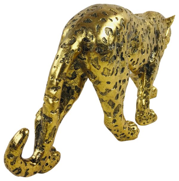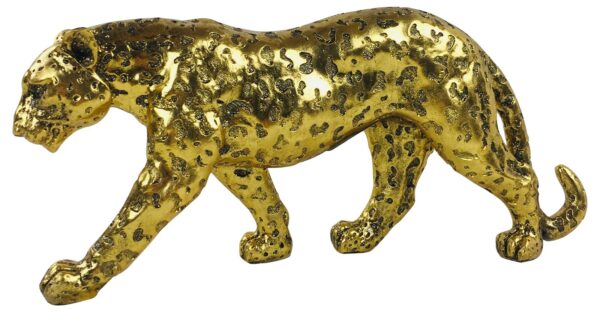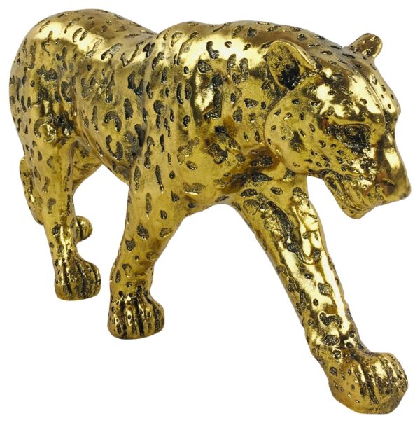 A beautiful ornament depicting a leopard elegantly walking. The leopard is made out of a durable resin with a gold painted finish. A copious amount of detail can be seen across the leopards exterior, making this leopard ideal for any setting. The leopards spots have a glitter effect on them and have been engraved into the surface giving the leopard a textured feel to the touch. Measurements: W40cm D7cm H18cm. SKU: OR1321