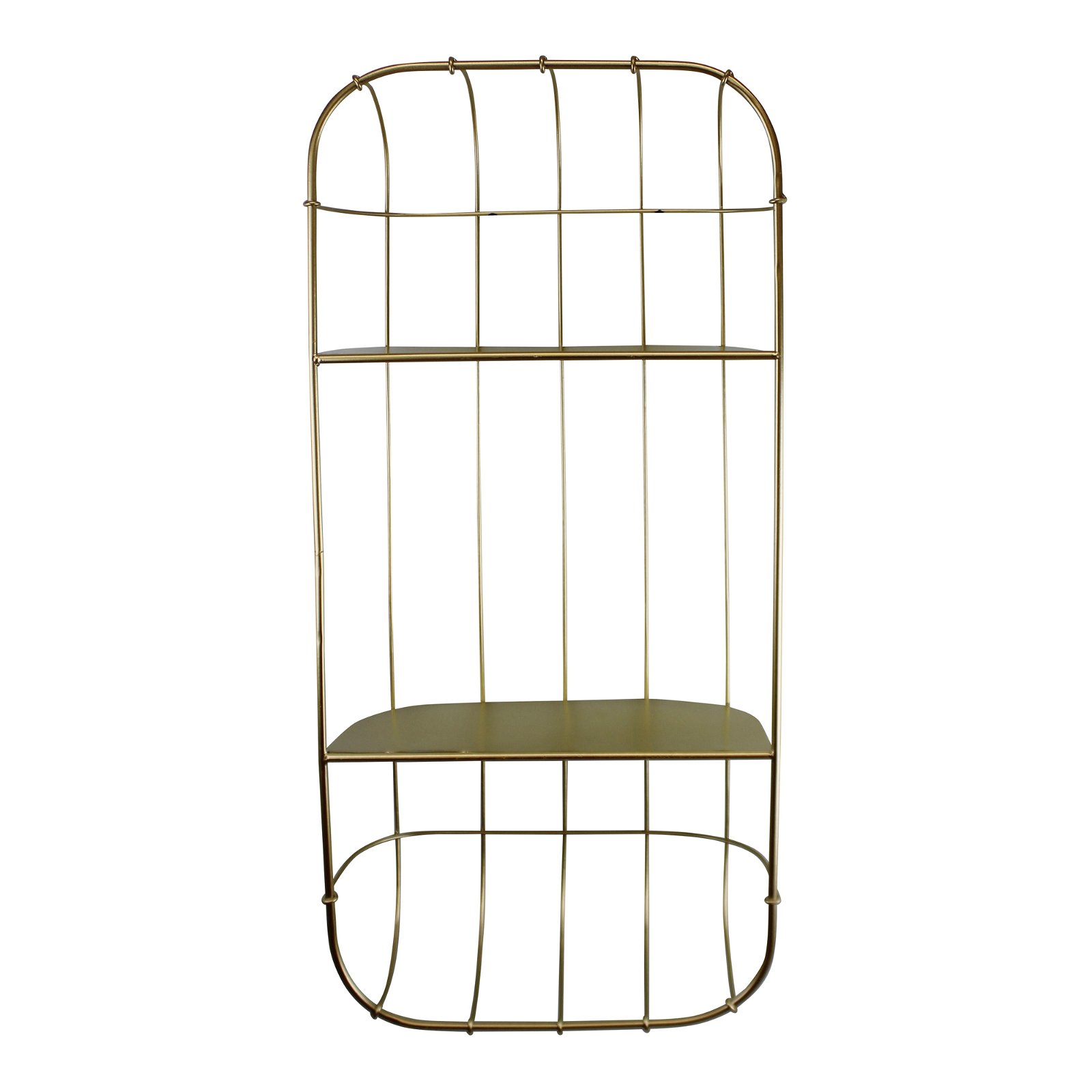 A gold metal shelving unit featuring 2 shelves in a basket style wire surround. Made of metal with a gold finish. 2 fixtures to the rear for wall hanging. Measurements: 17 x 77 x 36cm