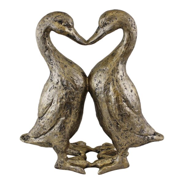 A pair of golden ducks facing each other to make a heart shape, a beautiful ornament for your home or would make a lovely gift. Made of 100% polyresin with a distressed gold finish. Measurements: 7 x 25 x 22cm SKU: OR1476
