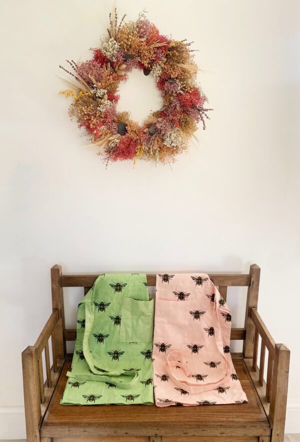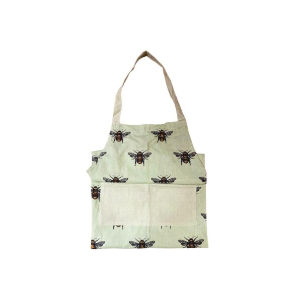 Charming green bee print pinafore style apron. Made from high-quality cotton fabric, this apron features a delightful black and yellow be pattern, making it a cheerful addition to any kitchen. The pinafore style means that it covers your front and ties at the back for a secure and comfortable fit. The apron has a generous front pocket and adjustable waist ties and is machine washable. Measurements: D0.1 x H78 x W68cm
