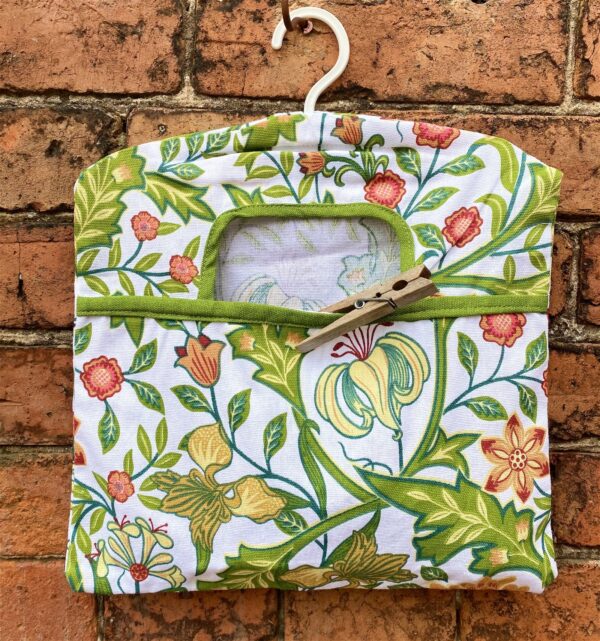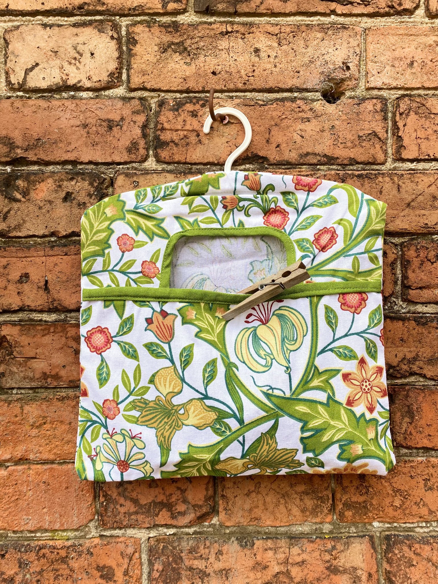 A hanging peg bag made from 100% cotton in the Sussex botanical range print. A plastic hanger is sewn in the top for practicality and a subtle green coloured binding enhances the front pouch access. Measurements: D1 x H36 x W30cm