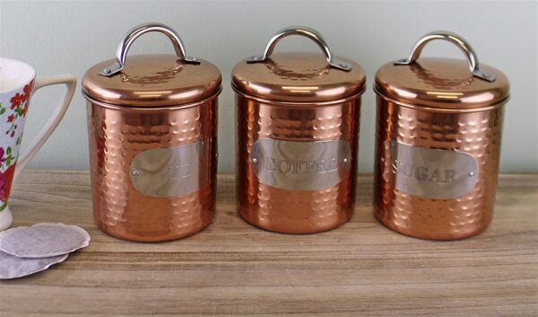 A set of 3 canisters for tea, coffee & sugar in a popular, hammered copper design. Made of 100% stainless steel, this item is foodsafe and features a rubber seal to keep items dry and fresh. Each tin measures W10 D10 H14cm. SKU: KG0322