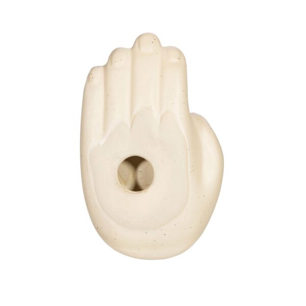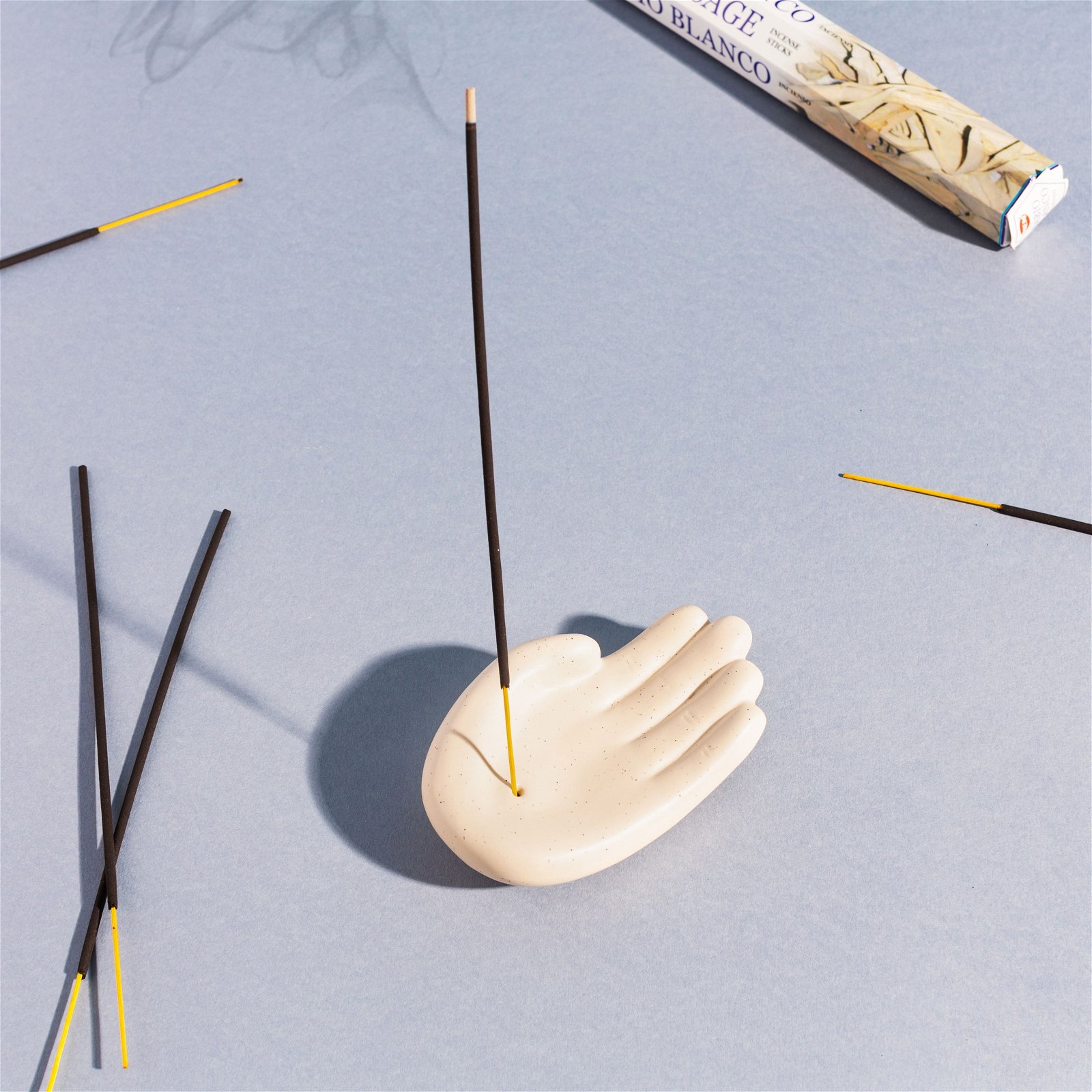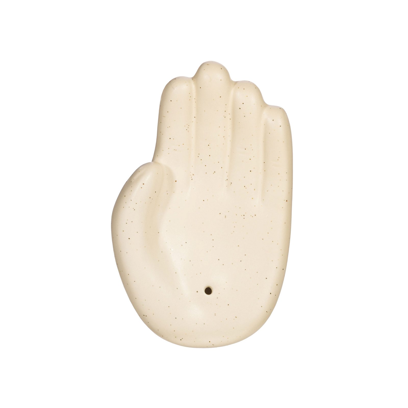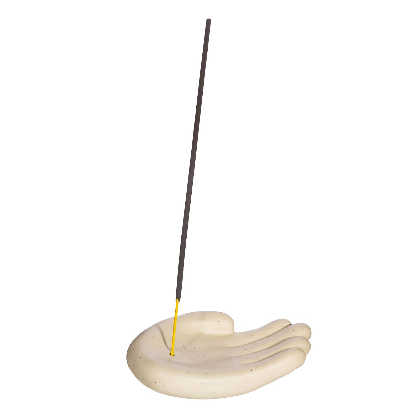 Crafted from stoneware to create a hand design, featuring a colourway of soft grey. Complete with an incense stick holder opening in the centre. Measurements: D12 x H2.8 x W7.4cm