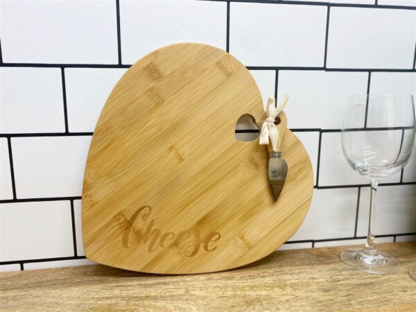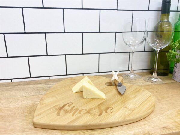 A natural bamboo heart-shaped wooden board for presenting your favourite cheeses. This stylish board is engraved with the word ‘Cheese’ and has a heart cut out. This set includes a cheese knife with wooden handle which can be attached to the board with the natural tape included. Knife length 11.5cm and heart cut out 3.5cm x 3.5cm. The overall measurements are: D3 x H30 x W28cm