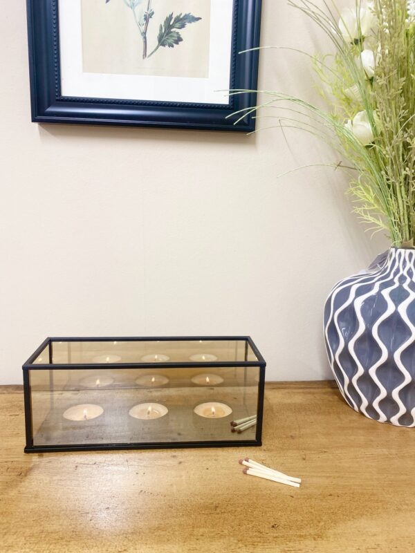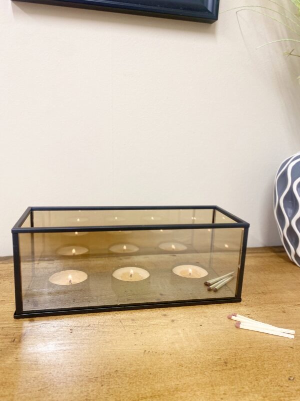 Add this unique piece to any mantel or tabletop for an enchanting new centrepiece. This mirrored rectangle box will reflect your burning candles creating an endless light effect. The tealight holder frame is made from iron with mirrored glass panels. Measurements: D8 x H8 x W21cm