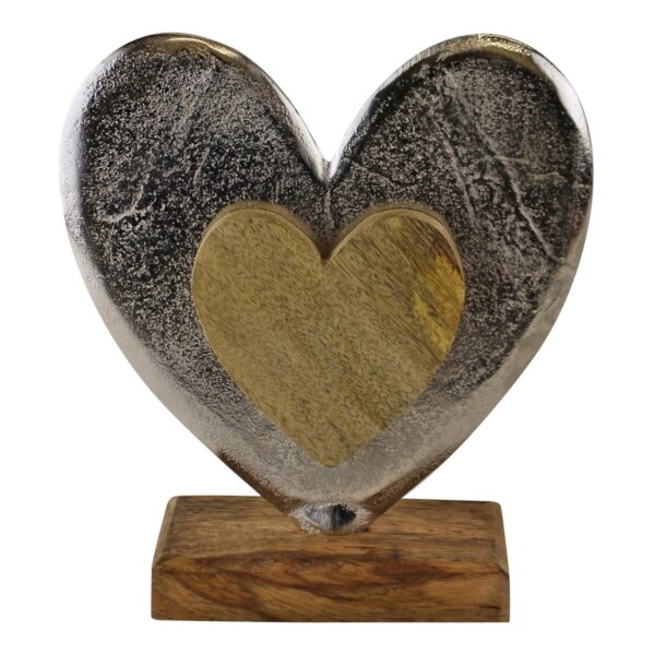 A large heart ornament in silver metal and naturally finished wood. The heart is made of aluminium with a wooden heart imposed and a wooden base. Measurements: 6.5 x 20 x 18cm SKU: OR1150