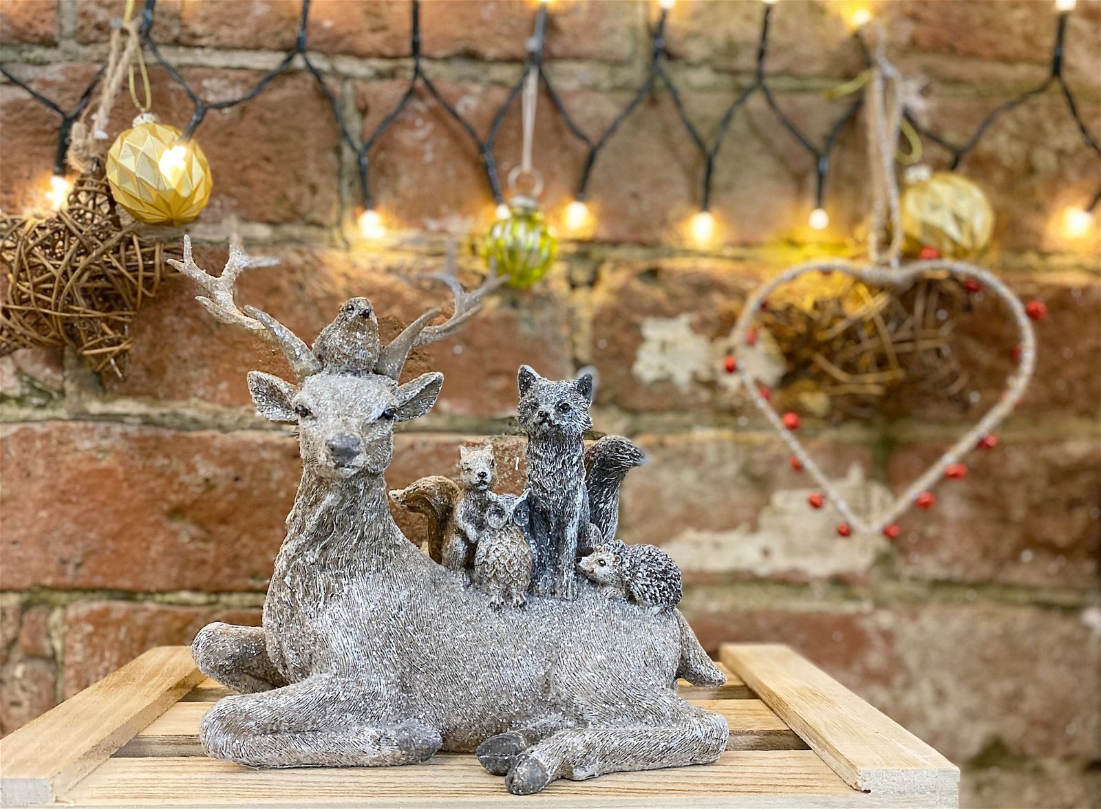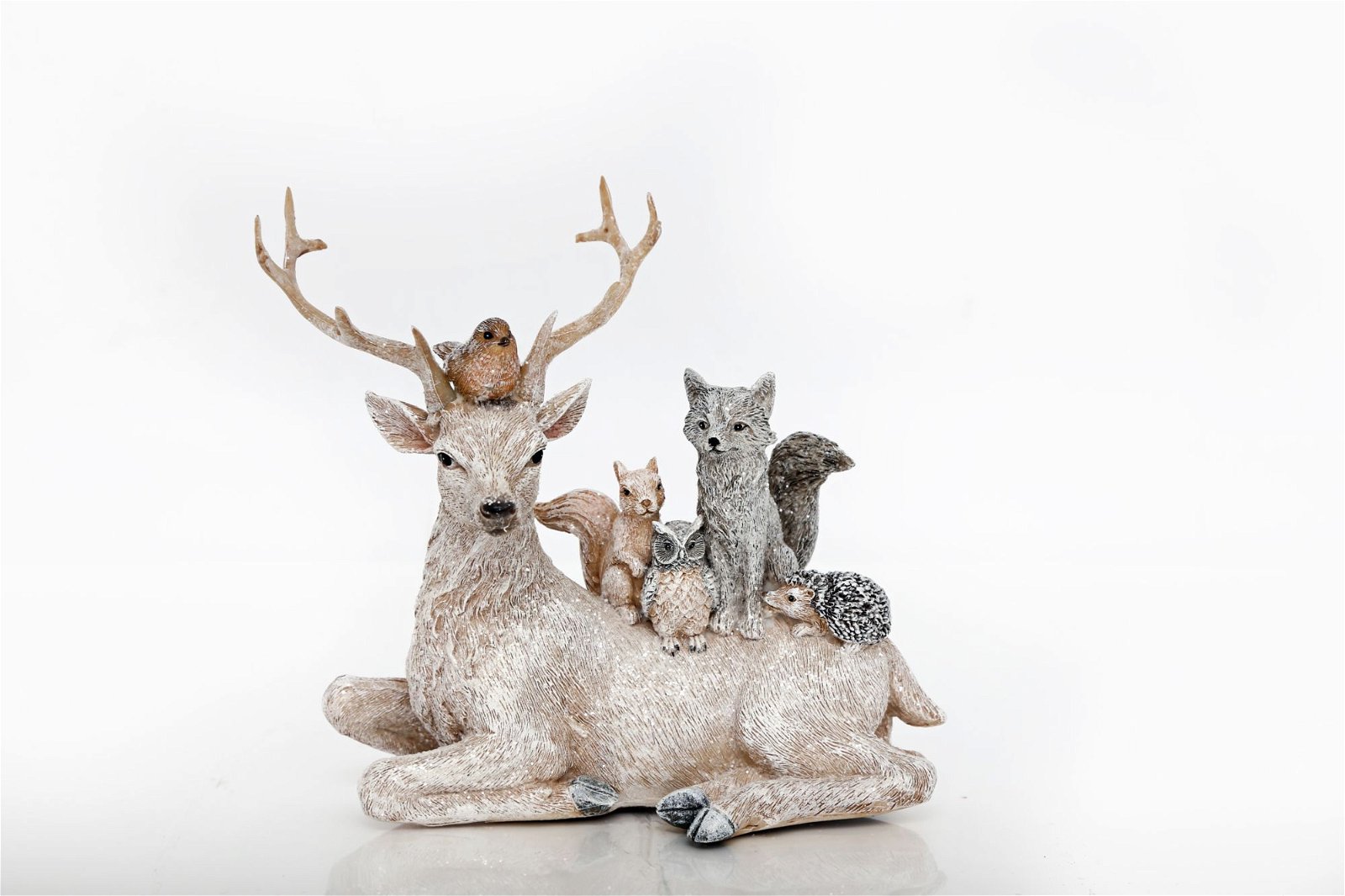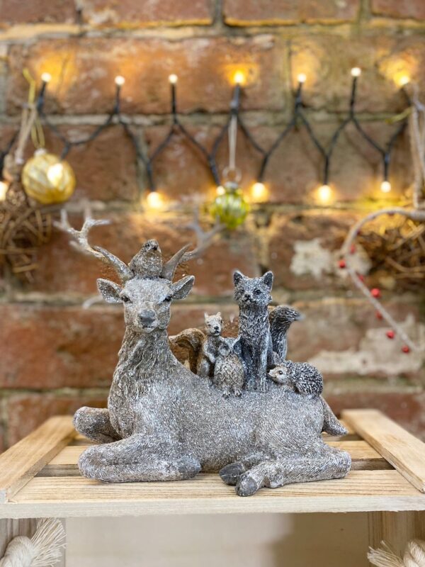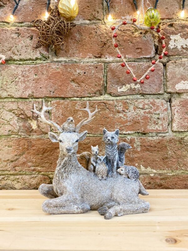 This is the most adorable ornament of a reindeer lying down with a robin between the antlers and a squirrel, owl, fox and hedgehog sitting on his back. This exquisite piece is crafted in a neutral coloured resin adorned with subtle glitter finish. The ornament is 16.5cm long and 18cm tall. The additional figures are respectively sized. Overall measurements are: D11.7 x H19.6 x W22.5cm