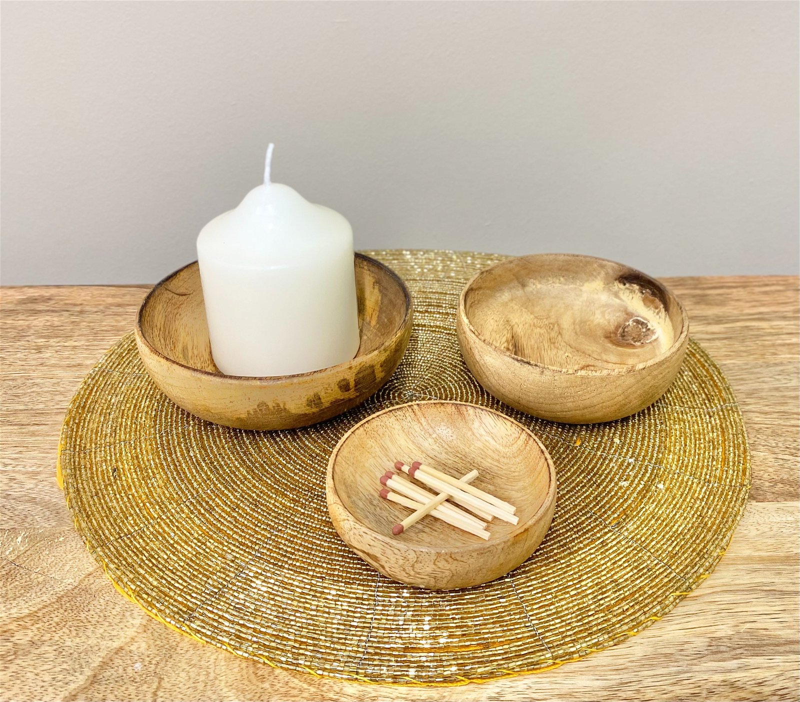 A set of three crafted wooden bowls suitable for nibbles or trinkets. The large bowl is 12.5cm in diameter, Medium 10.5cm diameter and the small is 8.5cm in diameter. When nested the overall measurements are: D13 x H6 x W13cm SKU: KG0973