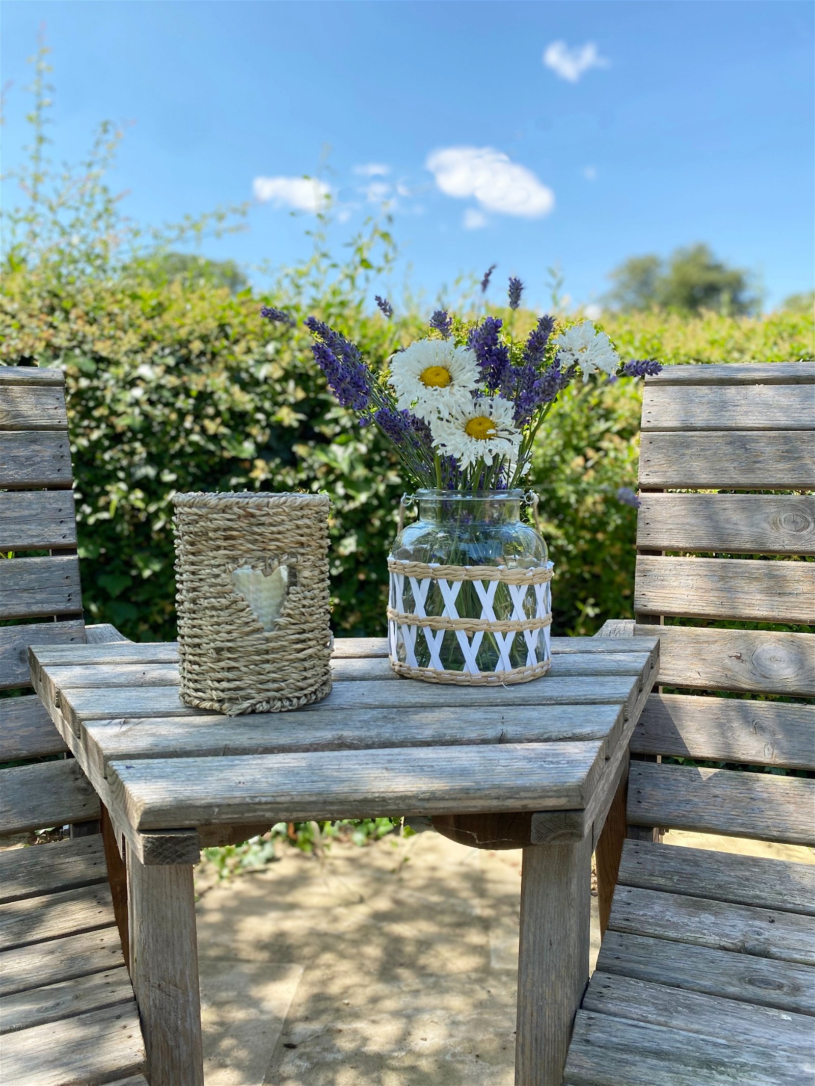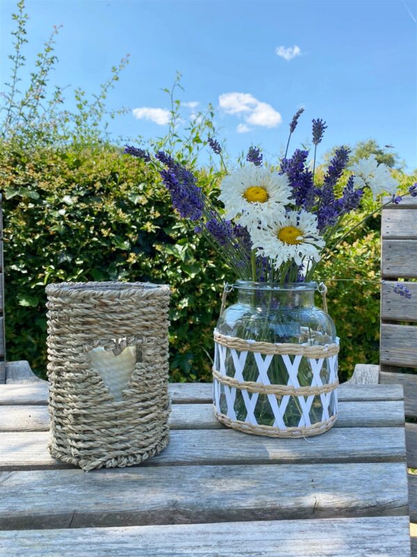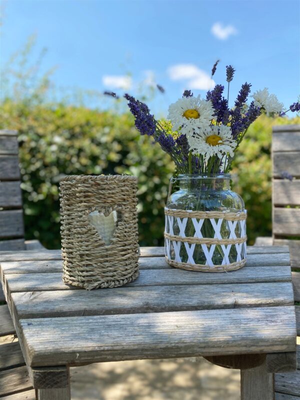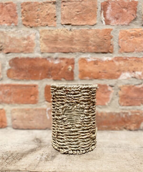 A medium twisted seagrass candle holder, with heart cut out and glass insert. Made with natural seagrass and held together with a wire metal frame. Can hold one medium candle or tealight. Measurements: D11.5 x H16 x W11.5cm