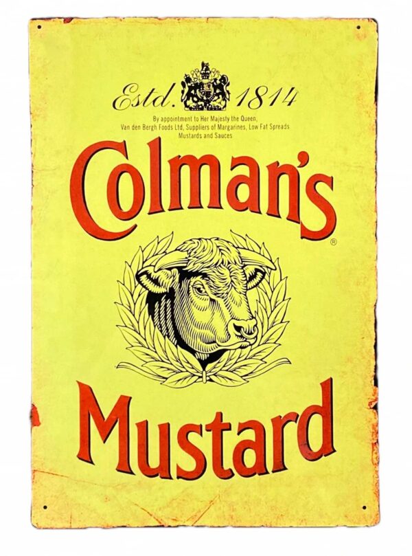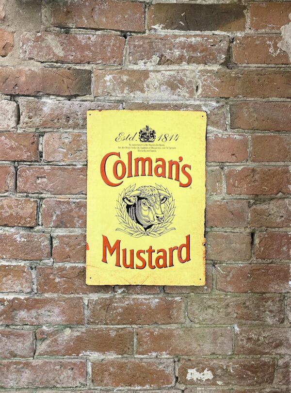 Part of our fantastic range of reproduction vintage metal signs. Colemans Mustard Yellow sign. Made in the UK from aluminium, suitable for use inside or outside. Every poster features 4 drill holes for ease of fixing to the wall. Measurements: D0.1 x H41 x W28cm