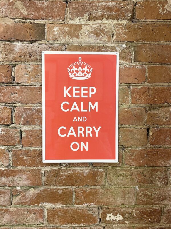 Part of our fantastic range of reproduction vintage metal signs. Keep Calm And Carry On sign. Made in the UK from aluminium, suitable for use inside or outside. Every poster features 4 drill holes for ease of fixing to the wall. Measurements: D0.1 x H41 x W28cm