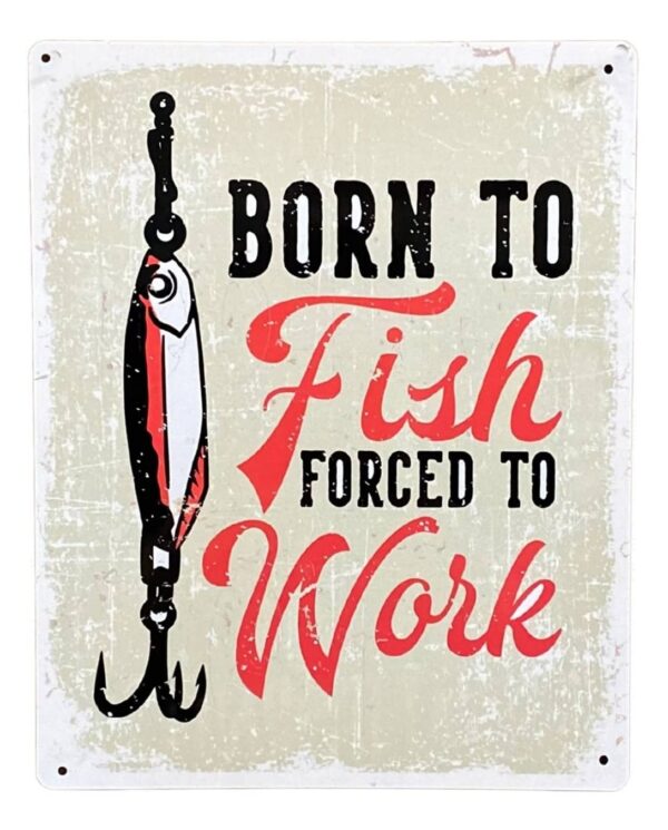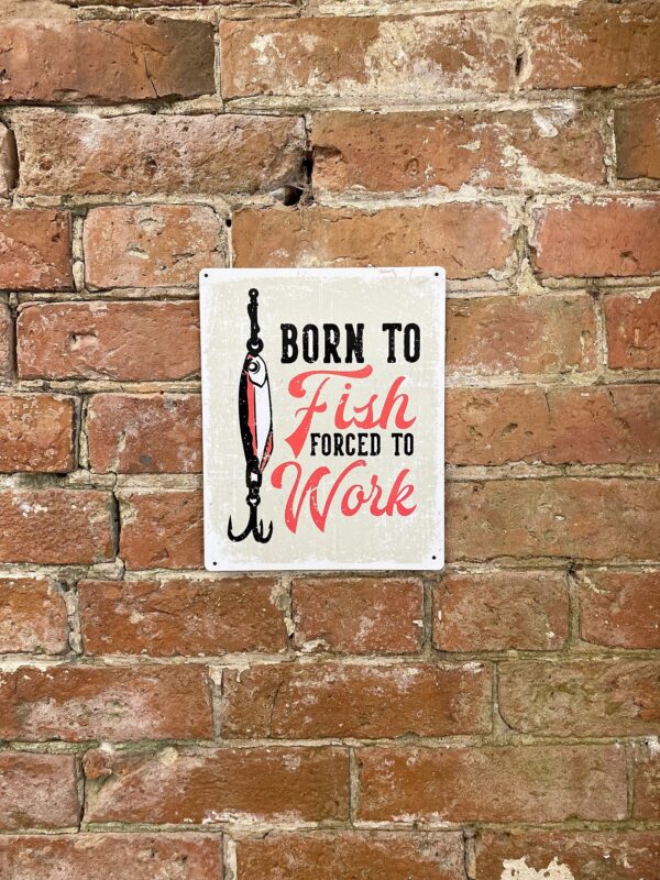 Part of our fantastic range of reproduction vintage metal signs. Born To Fish Forced To Work sign. Made in the UK from aluminium, suitable for use inside or outside. Every poster features 4 drill holes for ease of fixing to the wall. Measurements: D0.1 x H25 x W20cm
