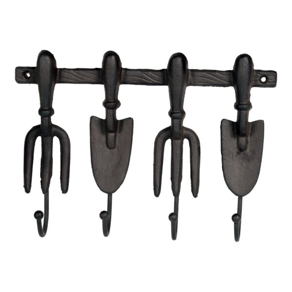 These metal tool shaped hooks would be a great addition to a potting shed. There are four hooks in total, two trowels and two forks. The distance between each hook is 6.5cm. Overall measurements are: D5 x H20 x W27cm SKU: PS0109