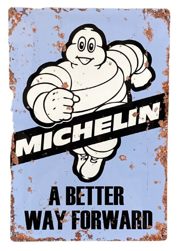 Part of our fantastic range of reproduction vintage metal signs. Michelin A Better Way Forward Tyres sign. Made in the UK from aluminium, suitable for use inside or outside. Every poster features 4 drill holes for ease of fixing to the wall. Measurements: D0.1 x H41 x W28cm