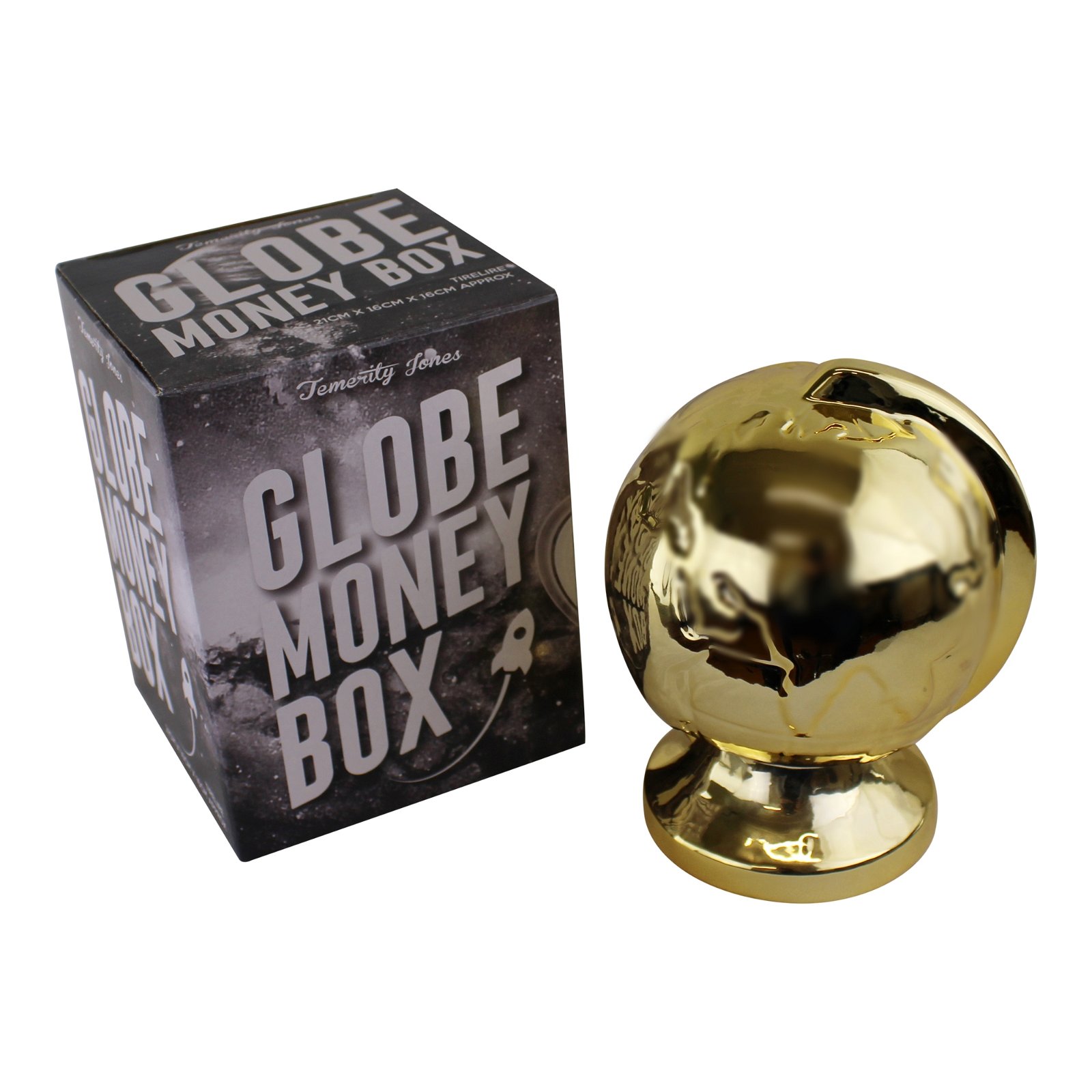 A gold coloured money box in the style of a globe with a coin slot to the side and a rubber stopper to empty the money box. Made of pottery with a glazed gold, metallic finish. Measurements: 12 x 16 x 12cm SKU: TJN0304