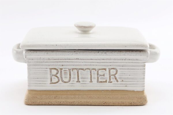 This practical and stylish butter dish with lid is natural looking with a neutral colour glaze. The glaze is detailed with a soft corrugated finish that enhances the appearance. Part of the Bocal range. Measurements: D11.5 x H10 x W19cm SKU: KG0922