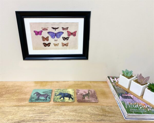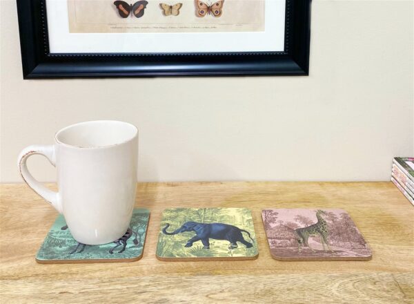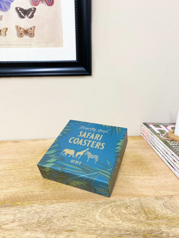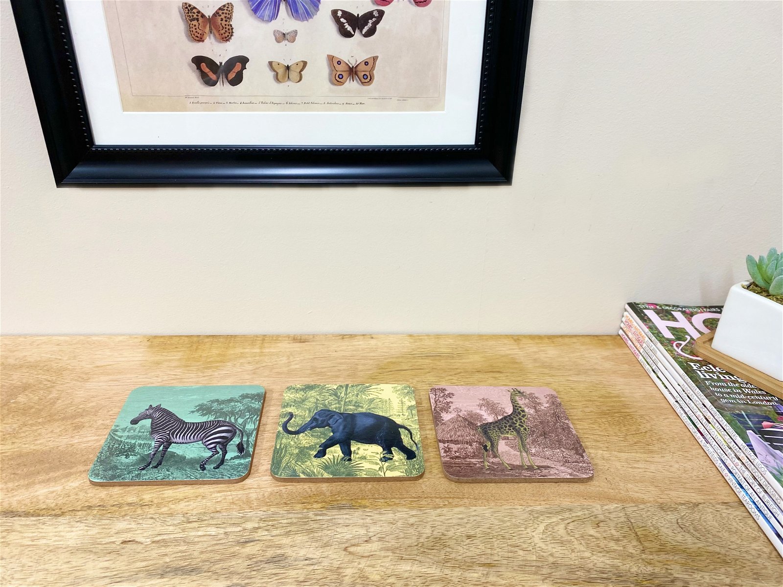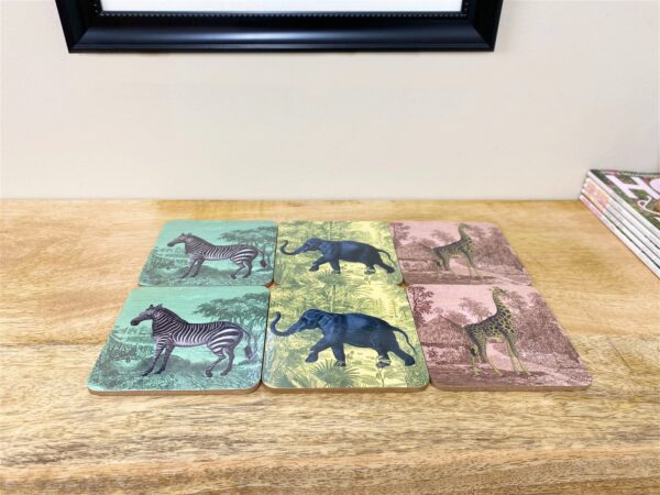 A set of six board coasters with a cork backing and a colourful Safari themed design. Each coaster measures 10cm x 10cm. This set of coasters feature three different designs; Giraffe, Elephant and Zebra. Perfect for avoiding ring marks on your furniture! The set comes complete with a sturdy cardboard gift box with a green base and safari themed lid, making it an ideal gift for a friend! Measurements: D11 x H3 x W11cm