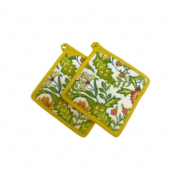 Pack of two pot holders/pot stands from 100% cotton, with hanging loop. Well padded pot stands/pot holders with mustard coloured binding. One side is mustard in colour to match the binding and the other features the Sussex botanical print. Measurements: D21 x H1 x W21cm