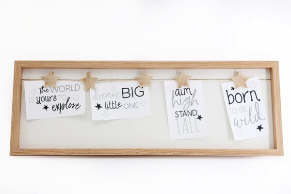 This natural wood landscape wallhanging photo frame has five small pegs decorated with carved star shapes that are fixed onto a length of string. The pegs are positioned to clip photos of 4 x 6 onto, both in portrait and landscape. Overall measurements: D2.4 x H22 x W62cm SKU: BB0390