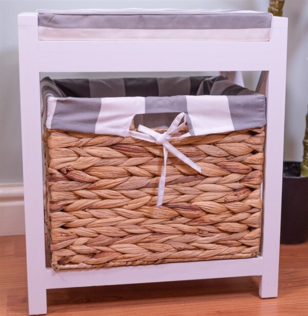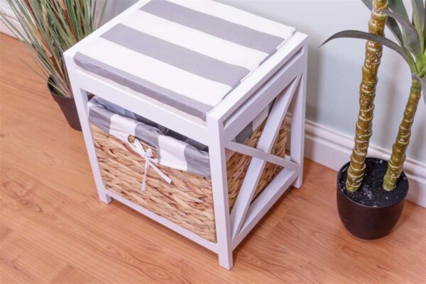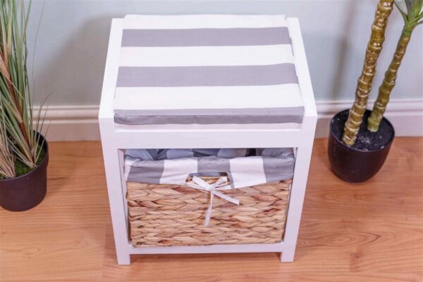 This single seat white storage bench with a grey and white striped cushion and 1 wicker basket drawer could be perfect storage in a small hallway or bathroom. The benches overall external dimensions are W40cm x D32cm x H45cm. The seat cushion has a grey and white striped design. The dimensions of the seat cushion are W34.5cm x D32cm x H4cm. The wicker drawer has a grey and white striped nylon insert. The external dimensions of the drawer are W33cm x D30cm x H26cm with the internal dimensions of W30cm x D27cm x H25cm. The legs are W3cm x D1.5cm x H4cm with a rubber floor protector. Overall measurements: D45 x H40 x W32cm