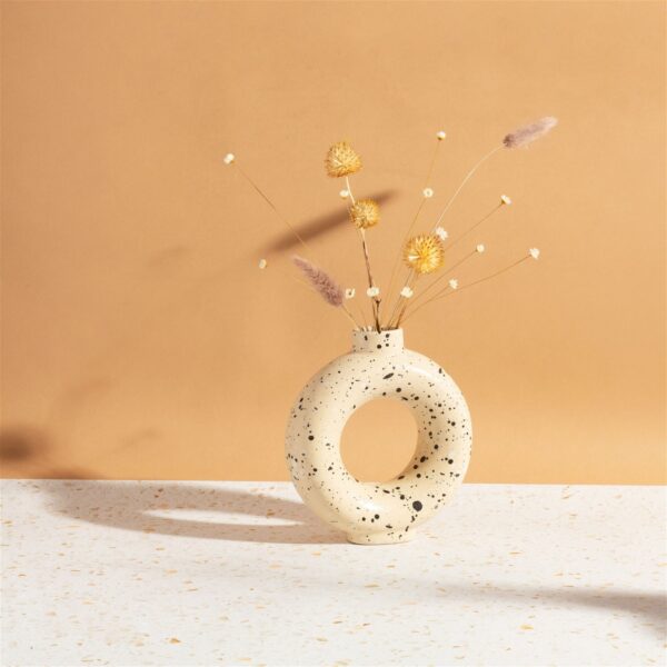 Finished with a speckled terrazzo effect, featuring a colourway of neutral sand this vase is designed for inside the home. Perfect for displaying fresh or dried flowers. This vase has been hand finished. Measurements: D14.5 x H16 x W5.5cm