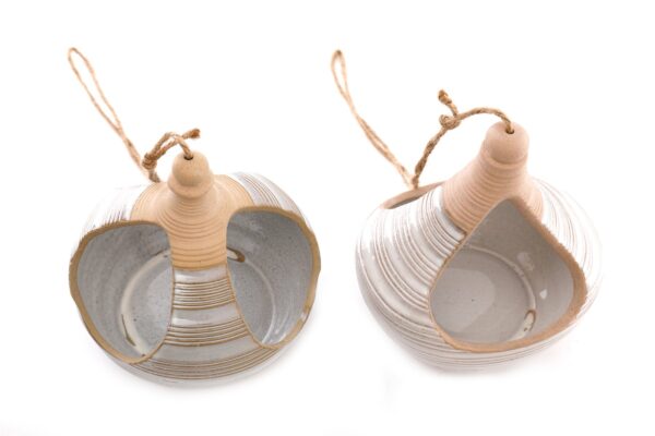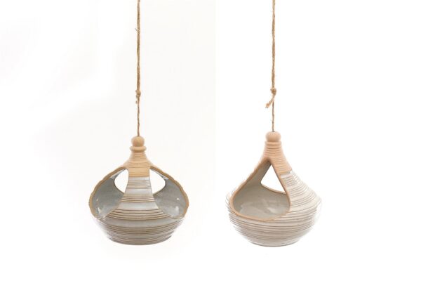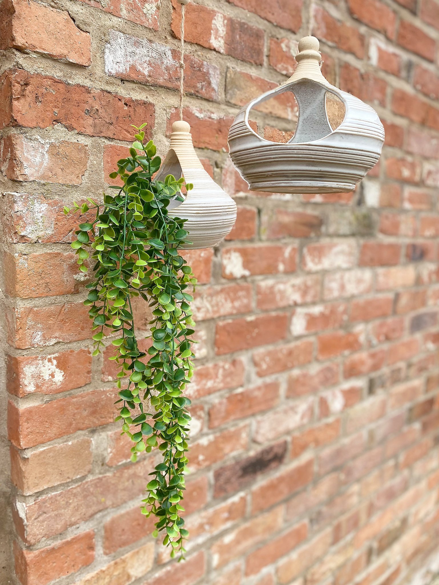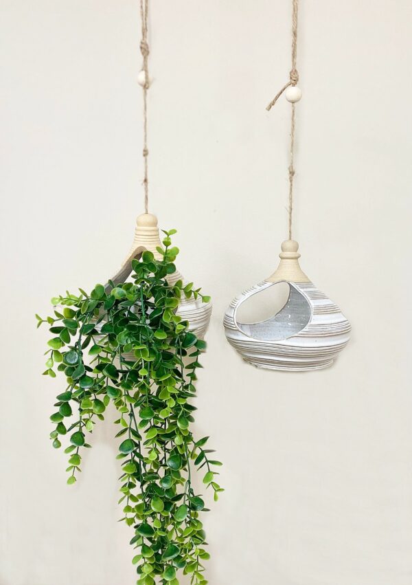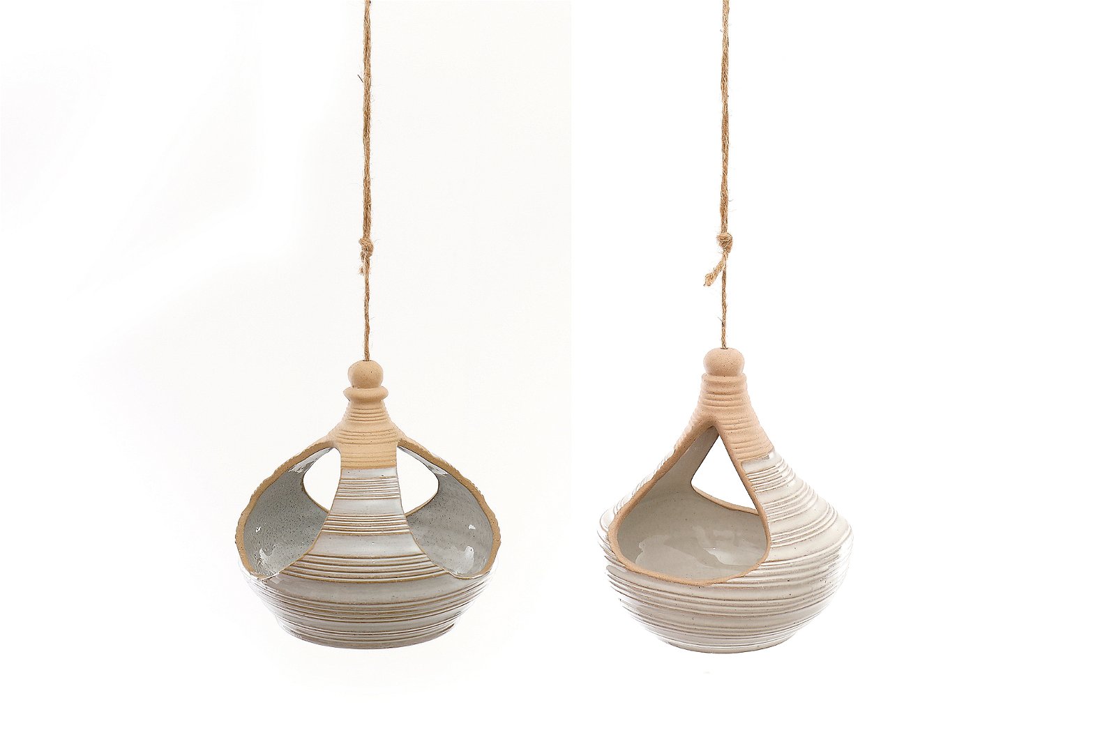 Set of two hanging sandstone planters. Two uniquely different natural sandstone coloured planters with tied jute string fixings. One planter has two openings for overhanging plants and the slightly larger planter has three. The larger oval planter measures 17.5cm x 14cm x 18cm. Measurements: D16.5 x H16.5 x W16.5cm