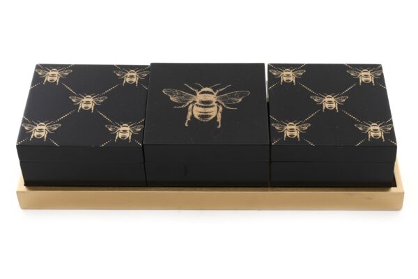 This set of three bee designed storage boxes set in a gold colour tray. The design and colours are very appealing and offer multitude of uses. The gold holding tray is 2.4cm deep and houses three wooden black storage boxes 10x10cm with a gold bee design on the lids with an internal size of 5.5x5cm. When nested the measurements are: D11.5 x H7.5 x W32cm SKU: TJBE28