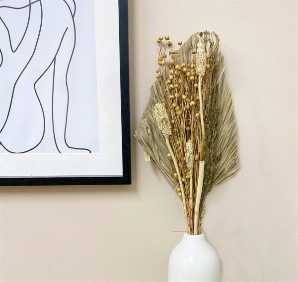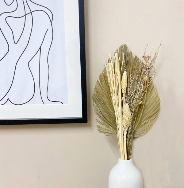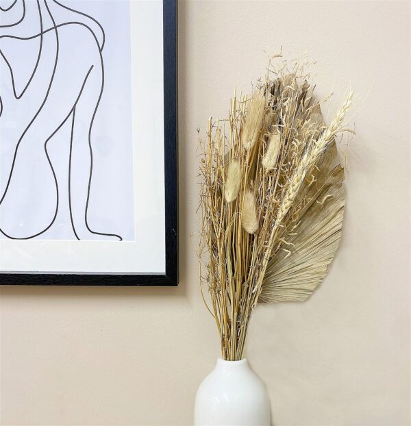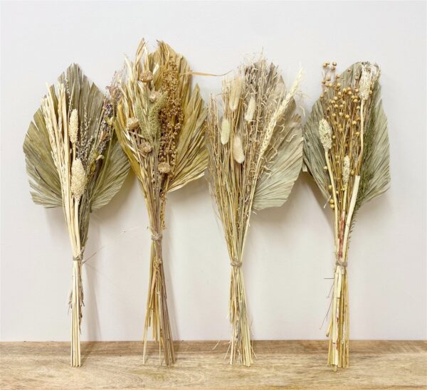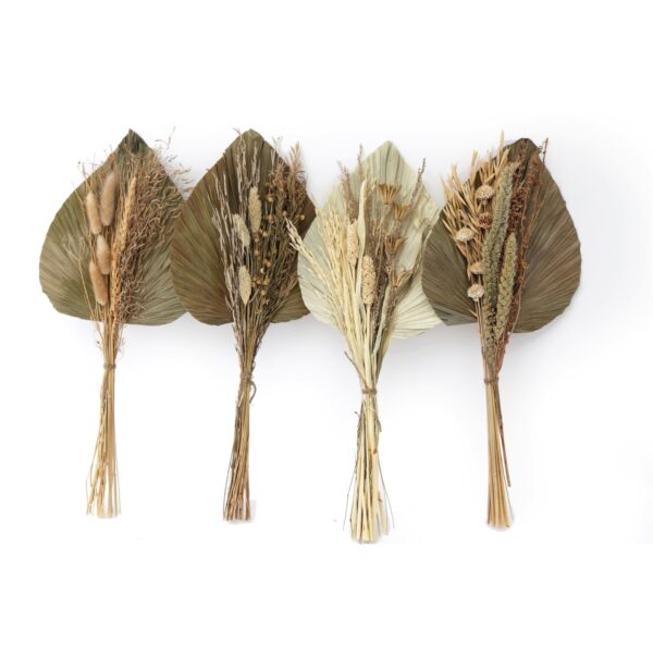 Each bouquet is made of an attractive selection of dried grasses in muted natural tones backed by a dried Palm spear. These bouquets of dried grasses would be ideal to create your own dried flower display for the home or could be used for any craft projects. Measurements: D10 x H50 x W16cm