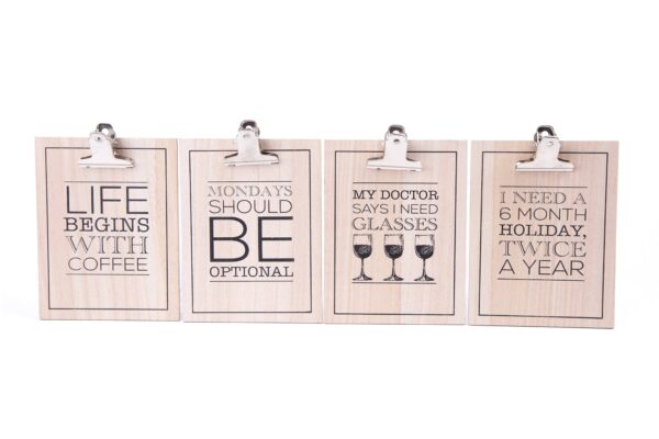 These four funny slogan clipboards add a touch of humour and light-heartedness to the daily grind. Life begins with coffee’ ‘Mondays should be optional’ ‘My doctor says I need glasses’ ‘I need a 6 month holiday twice a year’. Made from MDF with metal clip. Measurements: D3.5 x H18.5 x W13cm