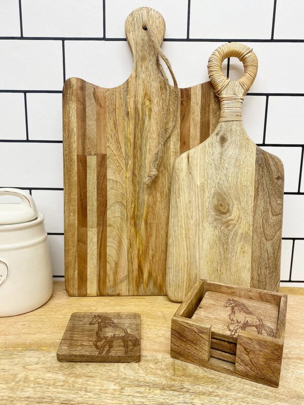 A set of four natural wood coasters with an engraved with a portrait of a horse. These sit within a wooden holder box with an easy access gap. Each coaster is 10cm square and made from 100% mango wood. Measurements: D12.5 x H5.5 x W12cm
