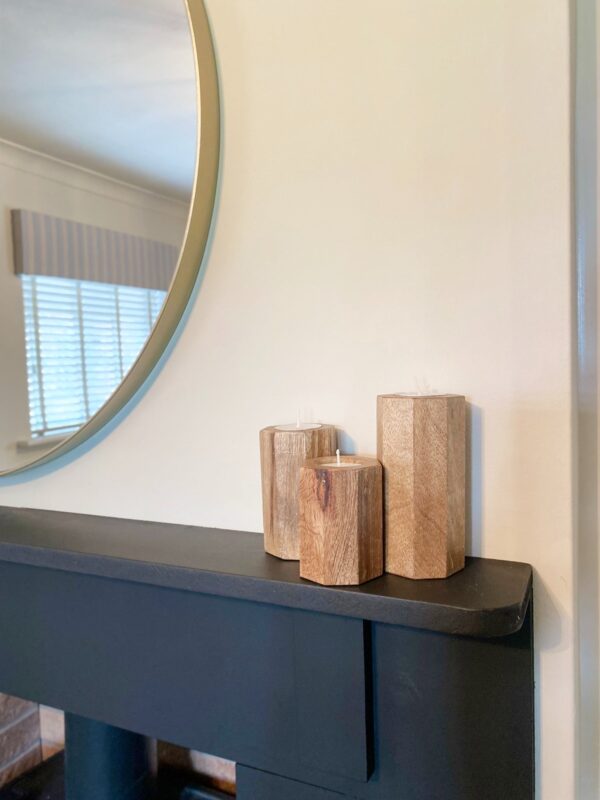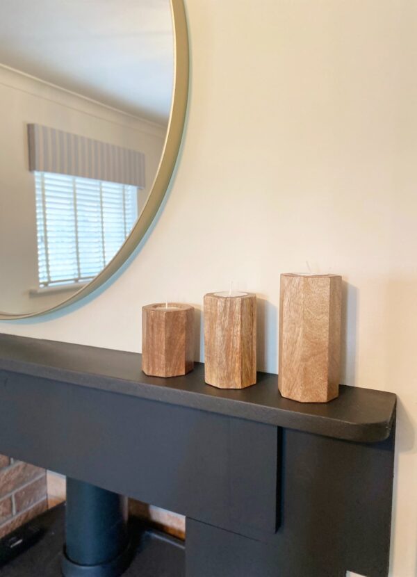 A stylish set of three hexagonal shaped wooden tealight holders. This set comes complete in three different sizes, with tealights already in the holders. Made from 100% Mango Wood. Measurements: D6 x H6 x W13cm