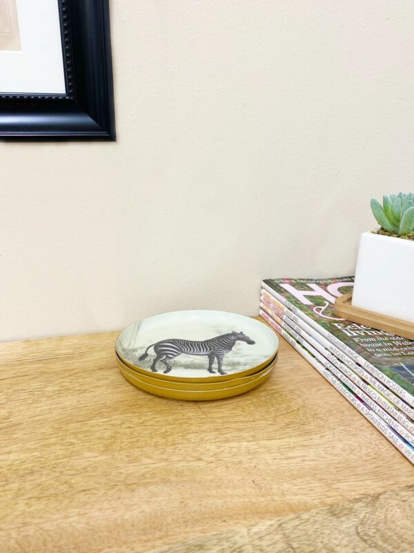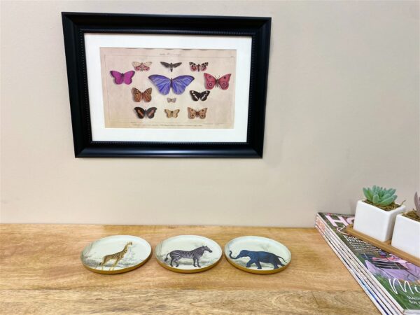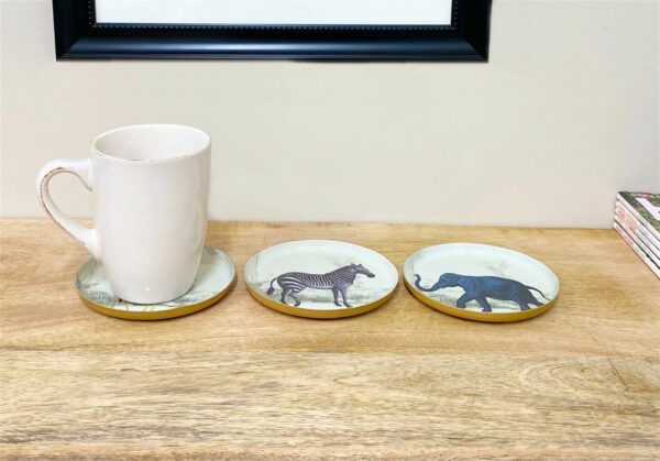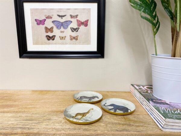 An attractive set of coasters featuring 3 designs, Zebra, Elephant and Giraffe. Each coaster has a diameter of 11cm with a small lip. The base of the coaster in gold has 3 felt pads to stop the item slipping on any given surface. Measurements: D11 x H1.7 x W11cm
