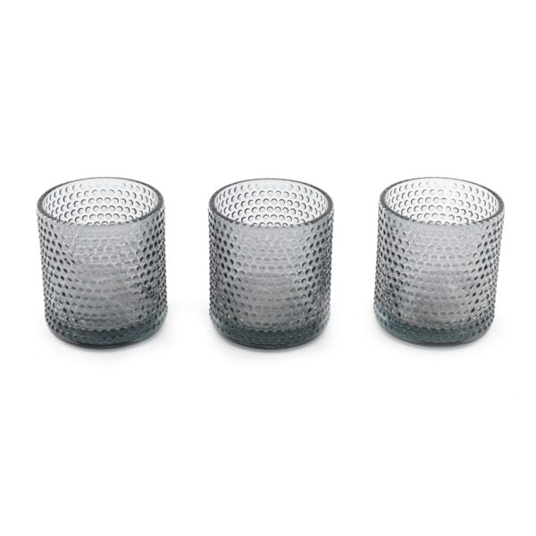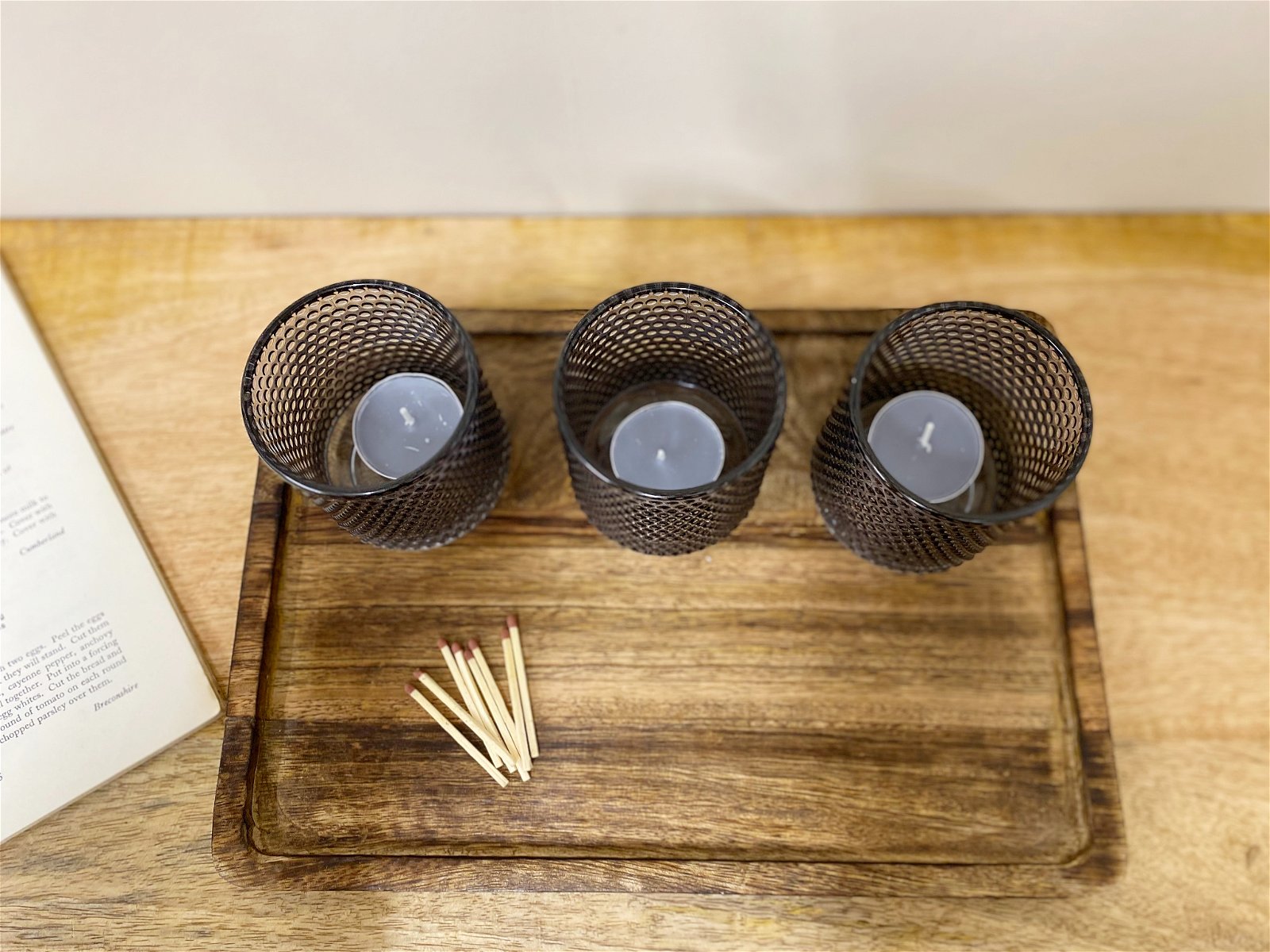 A set of 3 smoked glass tealight holders with a regular stippled effect. The set comes packaged with 3 fragrance tealights and would make an ideal gift. Measurements: D7 x H8.5 x W22cm