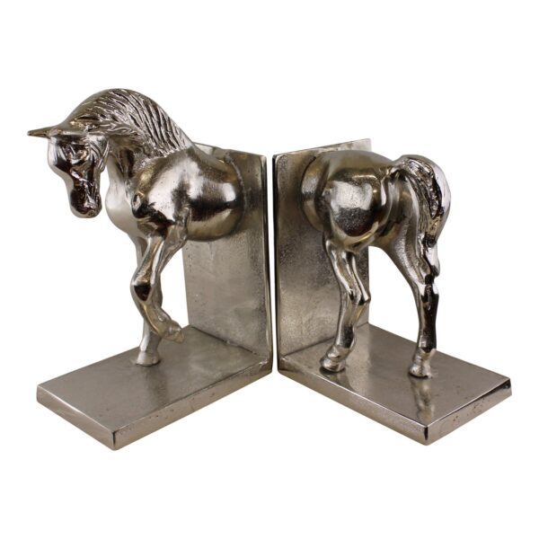 A stunning pair of silver aluminium bookends featuring 2 halves of a horse. Perfect gift for horse lovers and will look beautiful on a mantelpiece or bookcase. Made of 100% aluminium with a felt base and inner to protect your furniture and books. Measurements: 1 x 24 x 31cm SKU: OR1119