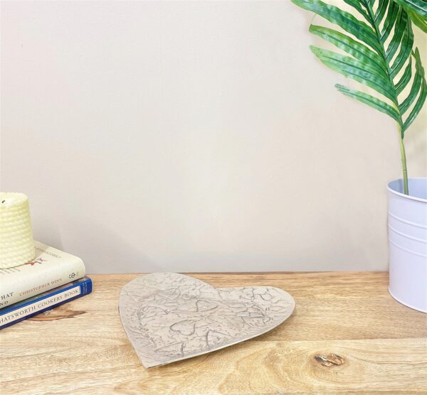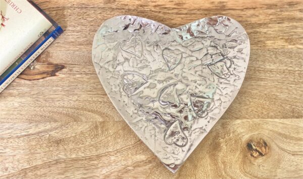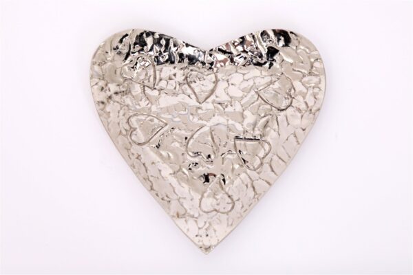 A silver hammered effect aluminium heart shape dish. The embossment is of a rustic theme with random heart design. Measurements: D22 x H1.5 x W22cm SKU: CH5950