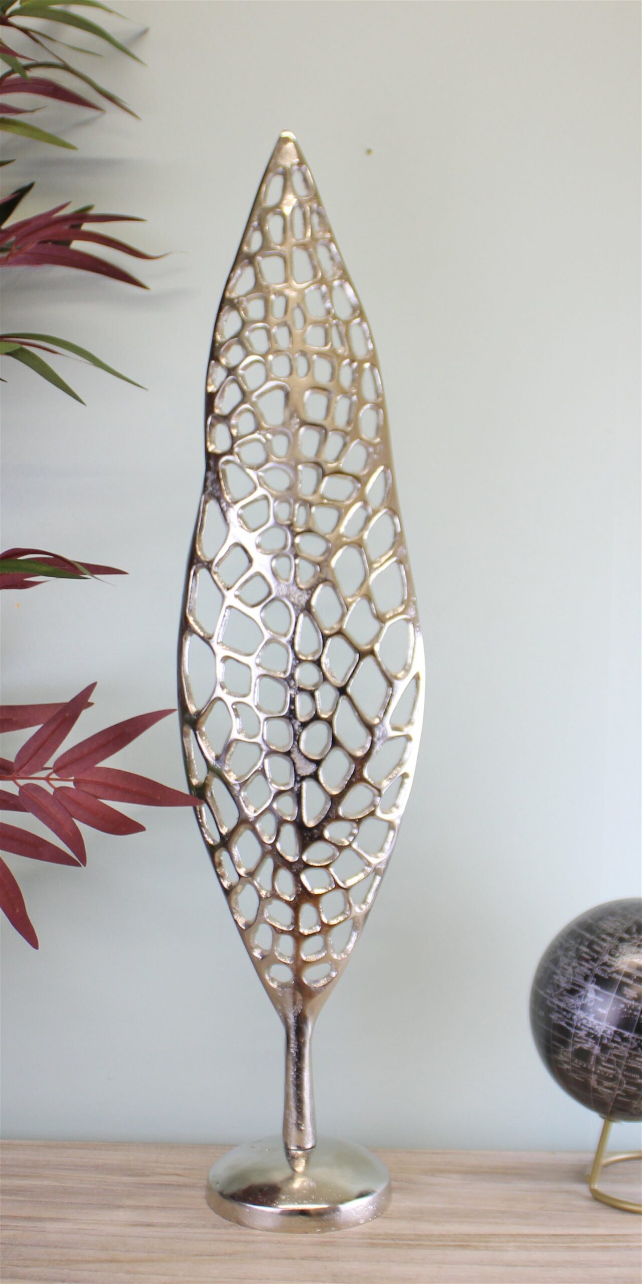 A stunning, tall sculpture in the style of a leaf skeleton. Striking ornament for lovers of silver decor. Made of aluminium. Measurements: 12 x 70 x 15cm SKU: OR1510